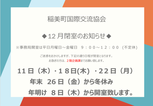 申込先:稲美町国際交流協会(平日9時~12時開室・不定休)